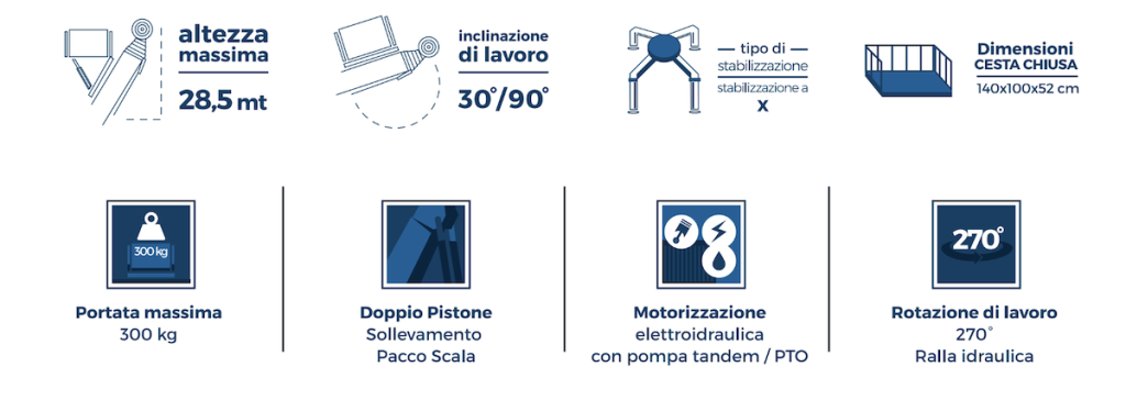 - Altezza massima di lavoro: 28,5 mt c.a.